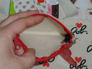 The pouch measures 9(height) x 12(length) cm with red zipper and a red heart charm that also doubles as its attaching loop. Of course, you can also use other charms the same way as the pouch doesn't have its own handle.
