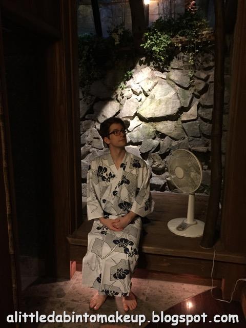 At resting spots like this, we found pitchers dispensing fresh hot green tea and cold mugi (barley) tea. There were also two trays, one for clean cups and glasses and the other for used ones. And yet other than hubby, you won't see another soul in any of my photos. It was as if the place was deserted even though the ryokan had at least a few dozen staff members. The only other folks we came across was an older couple who were the ryokan's regulars. The husband busted out some English as soon as he saw my hubby ^.^ We ran into them again the next day when we checked out, and what do you know, they were booking their next visit in the coming month as they were settling their bills.